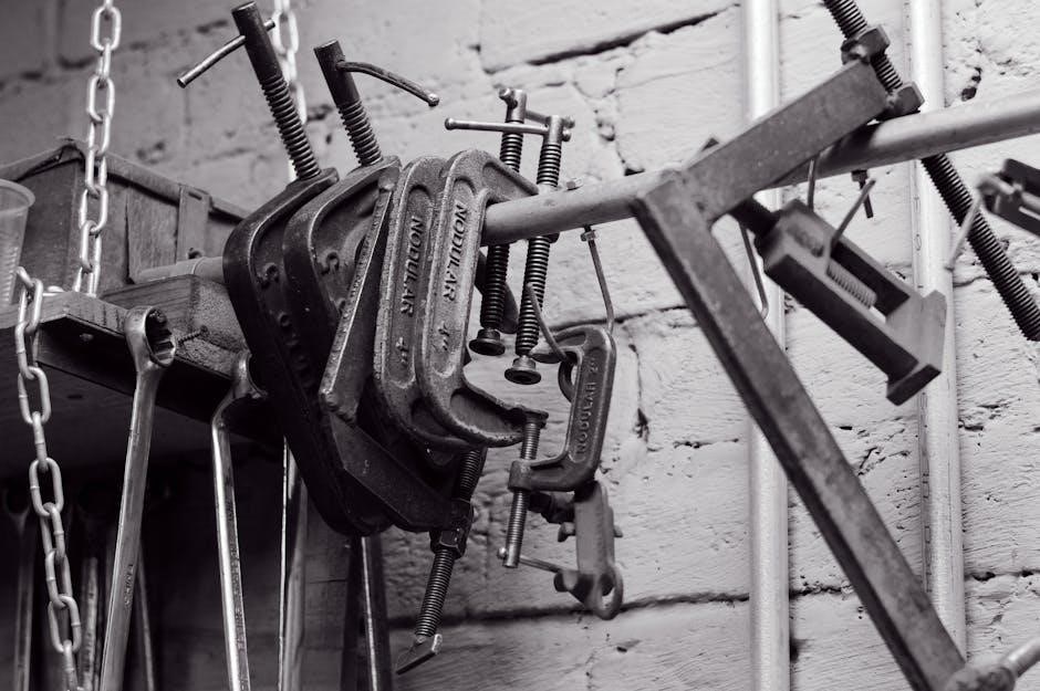 The guide showcases a variety of clamps, including C-clamps, spring clamps, and quick-grip clamps, explaining their advantages for different tasks. PDF resources emphasize the importance of proper workpiece alignment within the vise jaws to ensure accuracy and prevent damage.
